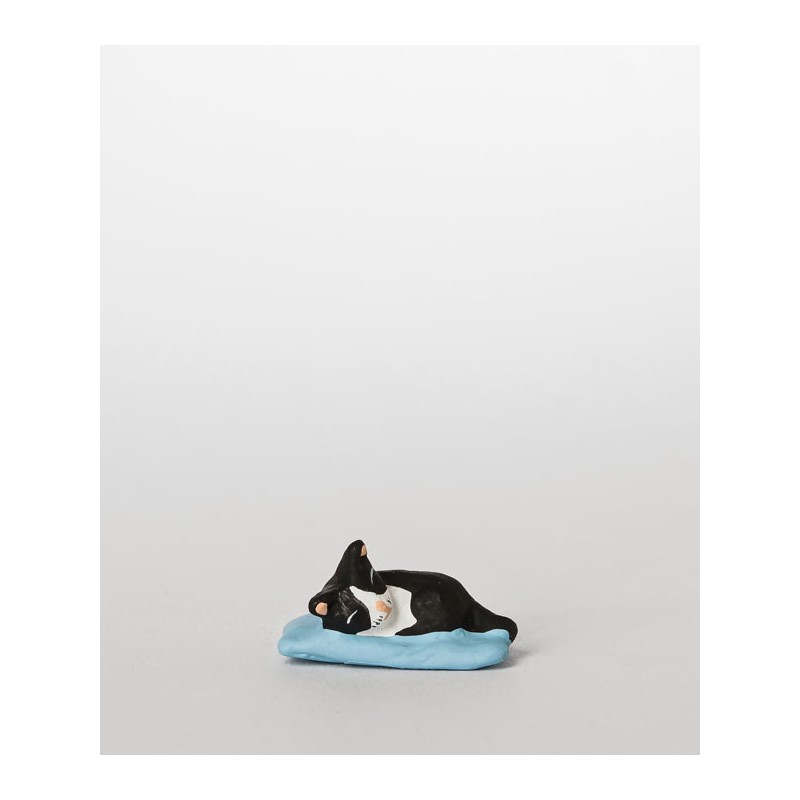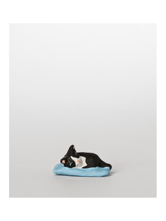 santon représentant un chat noir et blanc couché sur un coussin